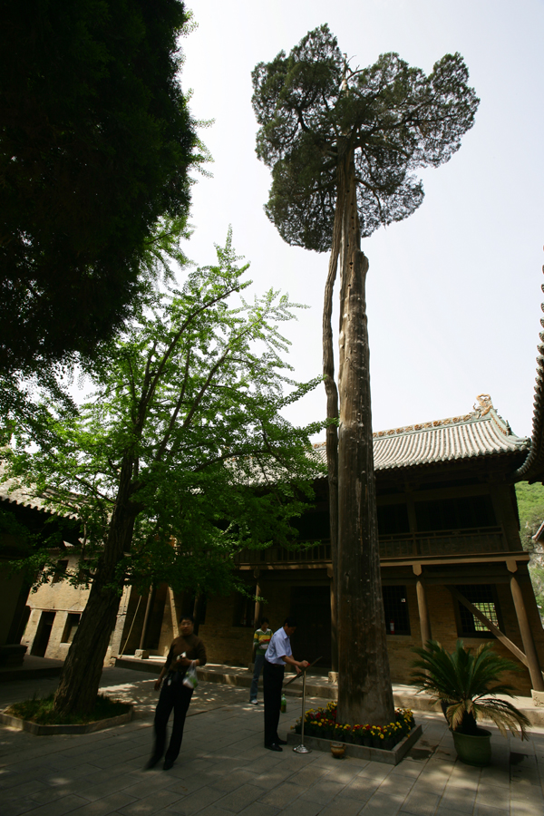 千年銀杏:在“子抱母”古柏之前,有根杏樹(俗稱白果樹)兩株。東為雄樹,樹徑5米,高約2.5米;西為雌樹,樹徑4米,高與雄樹相當(dāng)。銀杏樹雌異株,成活率極低,果實青白色,為珍貴藥材。這里的兩株大樹,每年夏秋兩季枝葉繁茂,遮天蔽日,雌樹還可收獲白果百余斤,既點綴了風(fēng)景,又生產(chǎn)了藥材,真可謂一舉兩得。