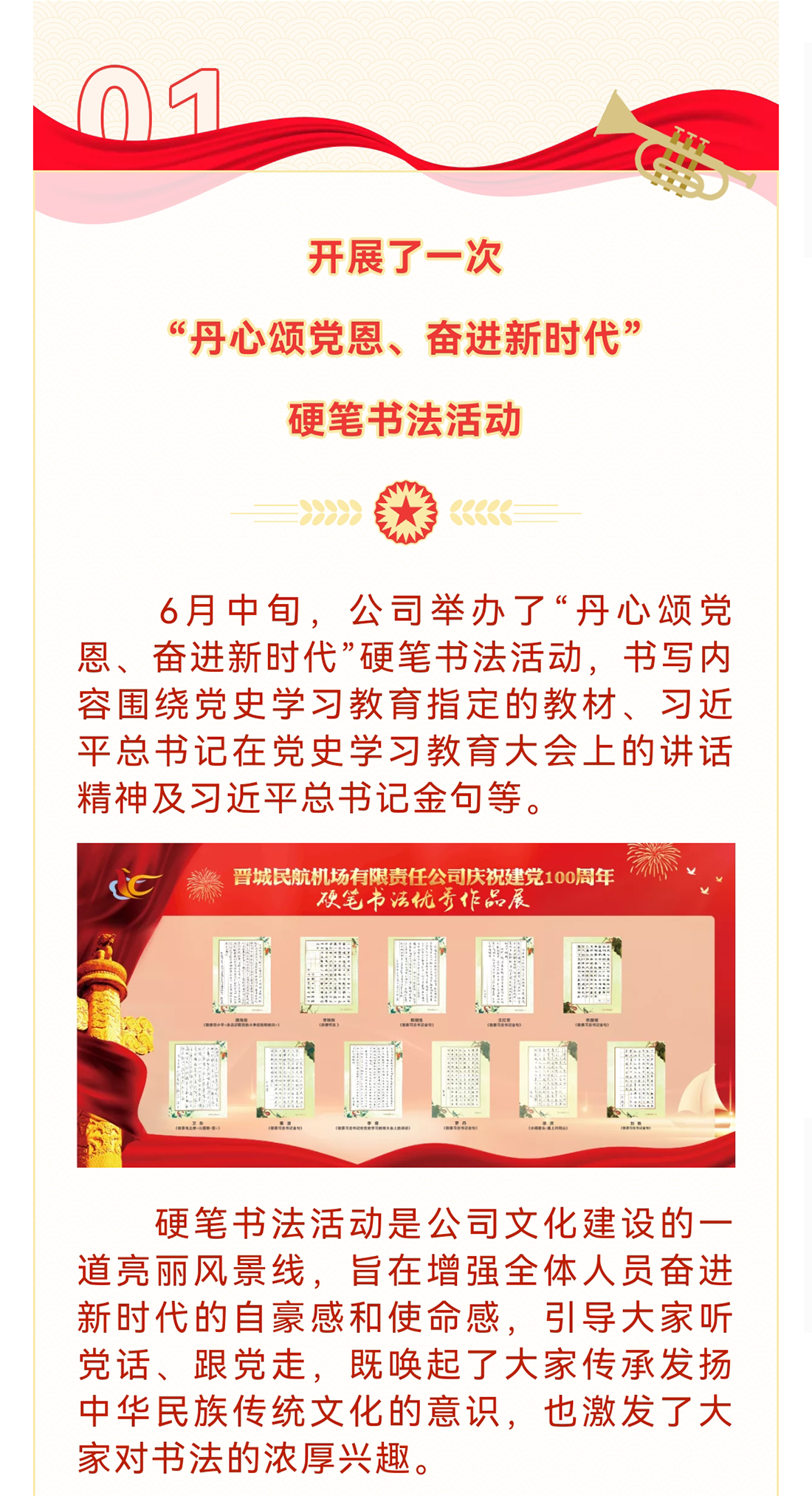在中國(guó)共產(chǎn)黨迎來百年華誕、全黨上下深入開展黨史學(xué)習(xí)教育之際,機(jī)場(chǎng)公司深情回顧黨的奮斗歷史,熱情謳歌黨的光輝業(yè)績(jī),開展系列活動(dòng)慶祝中國(guó)共產(chǎn)黨成立100周年。