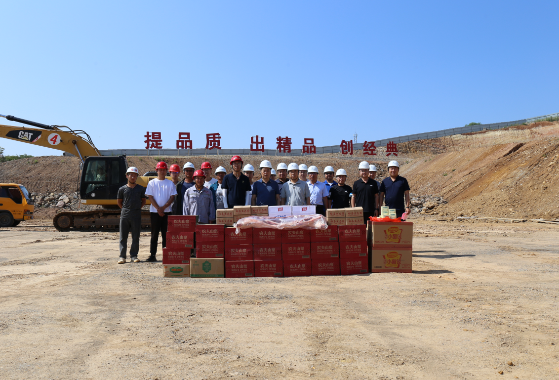 炎炎夏日,機(jī)場(chǎng)項(xiàng)目高填方工程試驗(yàn)(研究)段施工現(xiàn)場(chǎng)塔吊林立、機(jī)械轟鳴,一片繁忙景象。大批工人冒著酷暑,在工地?fù)]汗如雨。為將公司的關(guān)懷和慰問(wèn)及時(shí)傳遞給一線工人,6月16日上午,機(jī)場(chǎng)公司董事長(zhǎng)樊海放、總經(jīng)理郝少勤一行,赴高填方工程試驗(yàn)(研究)段施工現(xiàn)場(chǎng),向高溫天氣中一直堅(jiān)守在一線的工人們送去礦泉水、藿香正氣水、綠豆、冰糖、水果等高溫慰問(wèn)品,讓他們?cè)诳崾钪懈惺艿搅艘唤z舒心的涼意。