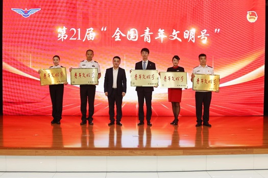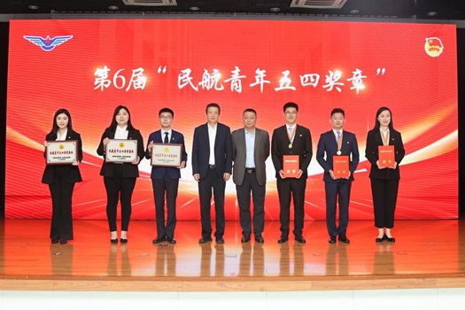 崔曉峰、馬兵為第6屆“民航青年五四獎(jiǎng)?wù)隆钡墨@獎(jiǎng)代表頒獎(jiǎng)