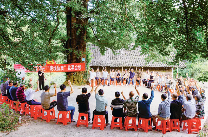 近年來,貴州省黔東南苗族侗族自治州施秉縣政協(xié)以“有事好商量,眾人的事情眾人商量”為理念,在群眾家門口搭建“開展院壩協(xié)商·建設(shè)和美鄉(xiāng)村”協(xié)商議事平臺(tái),推動(dòng)民主協(xié)商向基層延伸。圖為2024年7月4日,在施秉縣白垛鄉(xiāng)石家灣村,縣政協(xié)委員、村“兩委”成員、村民代表圍繞移風(fēng)易俗、美化環(huán)境、保護(hù)生態(tài)、助力和美鄉(xiāng)村建設(shè)開展協(xié)商。 人民圖片 磨桂賓/攝