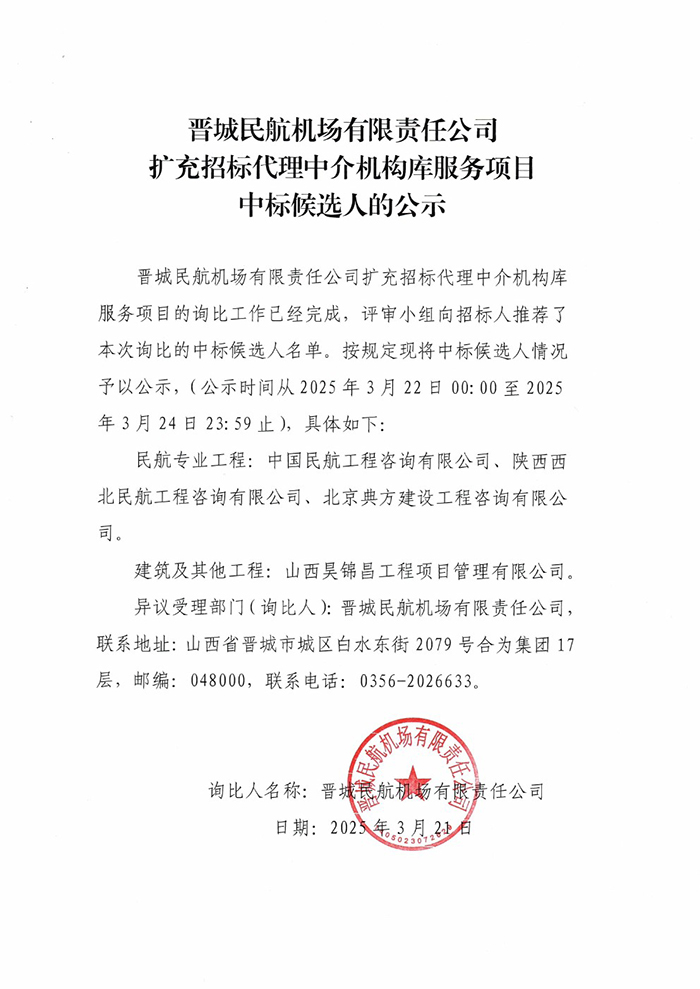 晉城民航機場有限責任公司擴充招標代理中介機構(gòu)庫服務項目中標候選人的公示
