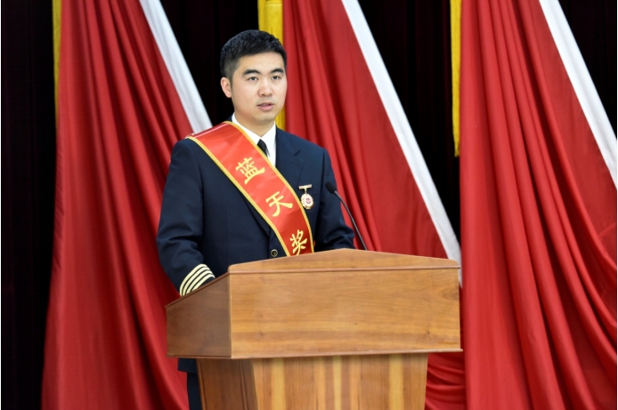 藍(lán)天獎(jiǎng)?wù)芦@得者、國航飛行總隊(duì)三大隊(duì)一中隊(duì)中隊(duì)長王雨寒宣讀倡議書