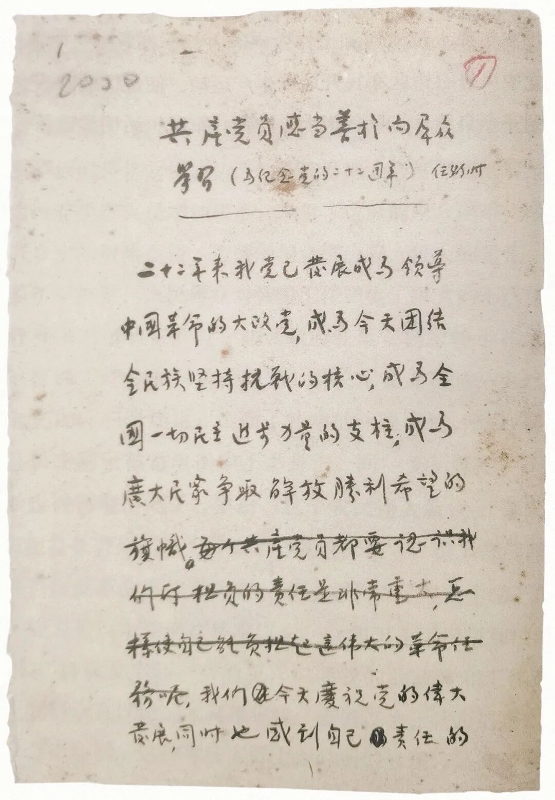 任弼時同志于1943年6月寫下的《共產(chǎn)黨員應(yīng)當善于向群眾學習》。中央檔案館藏